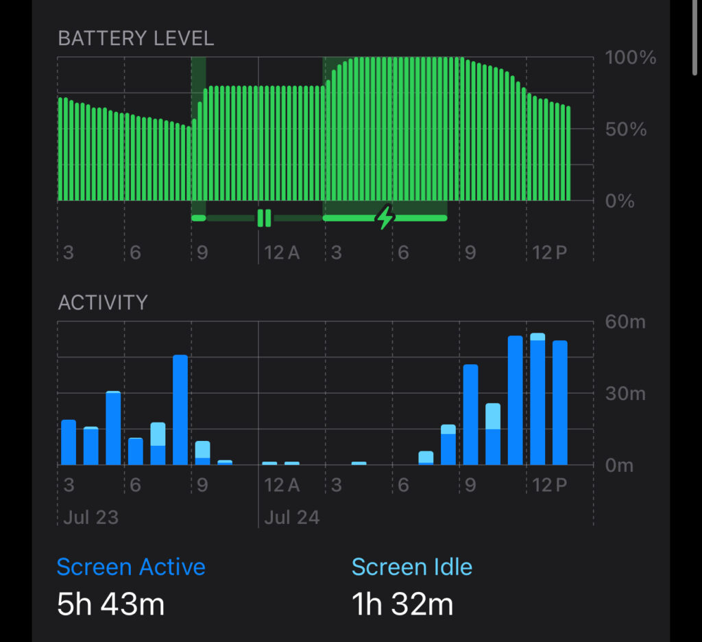 To view your detailed battery usage go to the “Settings” app, then open the “Battery” choice. This screen will show you the last 24 hours or last 7 days of battery usage. You can also view how long you were on each app by clicking the clock icon next to “Last 7 Days.”